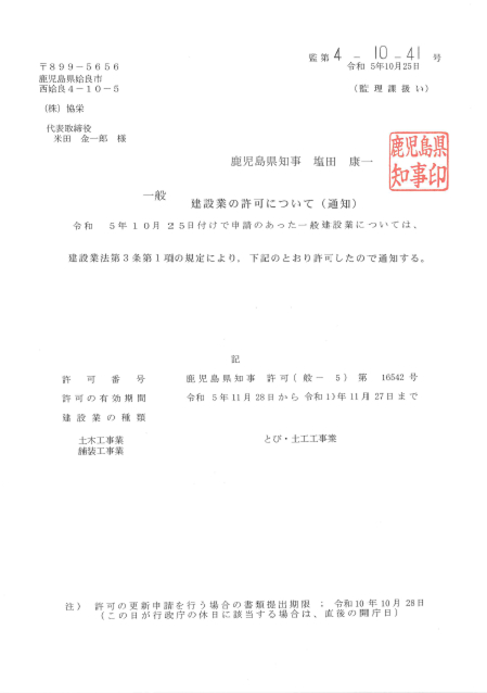 許可番号 鹿児島県知事 般-5 第16542号